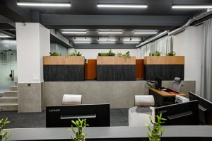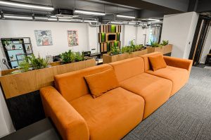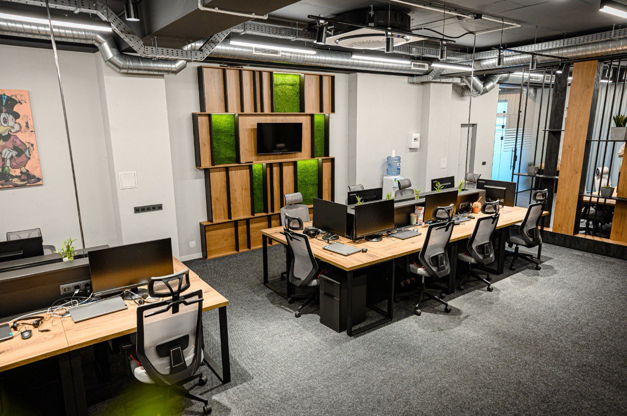 Wide desks, 27” monitors, ergonomic chairs, fast Wi-Fi, free drinks, kitchen, lounge — even a PS5.